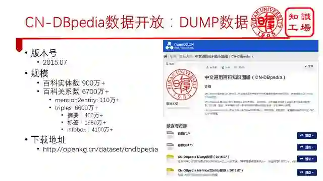 CN-DBpedia是一个开放的知识图谱。我们直接开放了Dump数据,大家可以从中文开放知识图谱的网站上进行下载。当前版本包含900多万的实体以及6700万的关系。