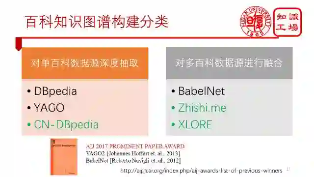 在前几天刚刚结束的IJCAI 2017会议上,评出了两篇卓越论文奖,分别给了YAGO2和BabelNet,这是一件令广大知识图谱构建者兴奋的事情,这代表着国际人工智能组织对于我们知识图谱构建工作的认可。同时,两类构建方法并列获奖,也说明了这两类构建方法都是非常重要的。