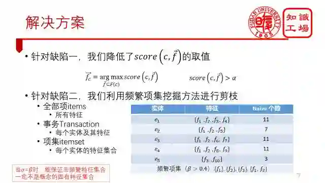 针对缺陷二,我们利用了频繁项集发掘的方法来进行剪枝。只计算哪些频繁的特征集合。我们在论文中证明了,只要频繁项集的支持度阈值和打分函数的阈值相同,就能保证非频繁特征集合一定不是概念的固有特征集合。
