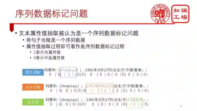文本属性值抽取被认为是一个序列数据标记问题。它是把整个句子当做是一个序列数据,每个属性值抽取器的抽取过程当做是序列数据的标记过程。1表示是属性的值,0表示不是属性的值。