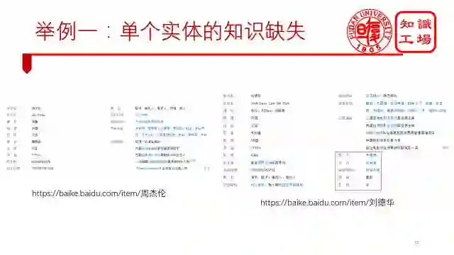 第一类是单个实体的知识缺失。比如缺失infobox,标签,摘要等信息。下图左边是周杰伦的信息,右边的刘德华的信息,刘德华的infobox信息就要比周杰伦多5个。这两个实体还都是最popular的实体,都有这么明显的差距。其他实体就更不用说了。