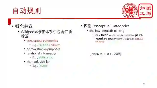 接下来一种是YAGO的做法。它认为实体的标签中蕴含着实体的概念信息,它将wikipedia的标签分为了四类。第一类是我们需要的概念型标签;第二个是基于管理目的的标签,如“缺少引用文献的词条”等;第三类是关系型标签;第四类为主题型标签。只有第一类是我们需要的。它的识别方法也很简单,使用了浅层语义解析方法来做。对于任意一个标签,首先从中识别出它的中心词,如果这个中心词是复数名词的话,那么这个概念就有很大可能性是一个概念型标签。当然,这个方法比较适合于英文,中文的话就很难这样做了。