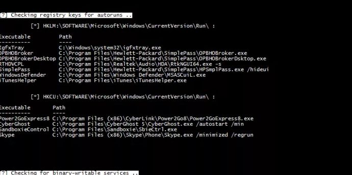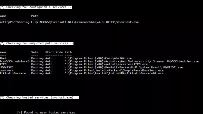 上图显示,脚本为我们枚举出了在后台运行的可配置和非引用路径服务。