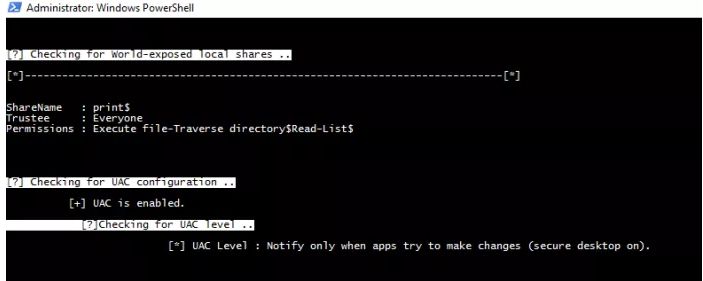 上图显示,脚本为我们枚举出了每个人的本地共享,并且“用户帐户控制”已启用。