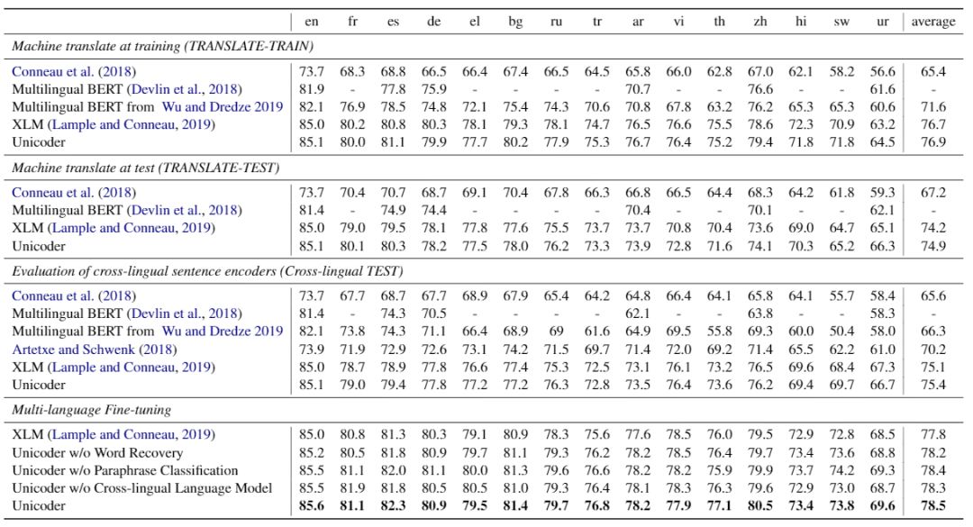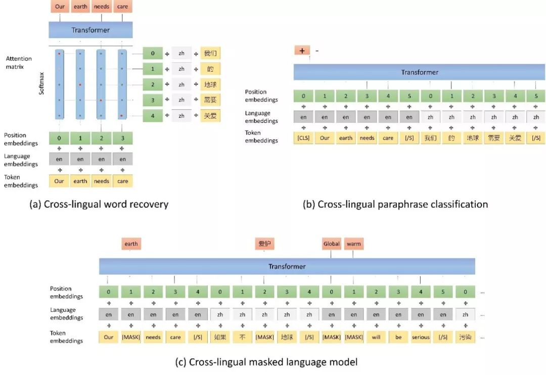 Unicoder [5]在XLM 的基础上,进一步提出了三个新的任务,使模型能够更好的学习语言之间的对应关系。三个任务分别是:跨语言的词语恢复,跨语言的同义句子分类和跨语言的 Masked Language Model。三个任务分别定义在词语、句子和段落级别,可以让模型从不同的层次学习两个语言的对应关系。