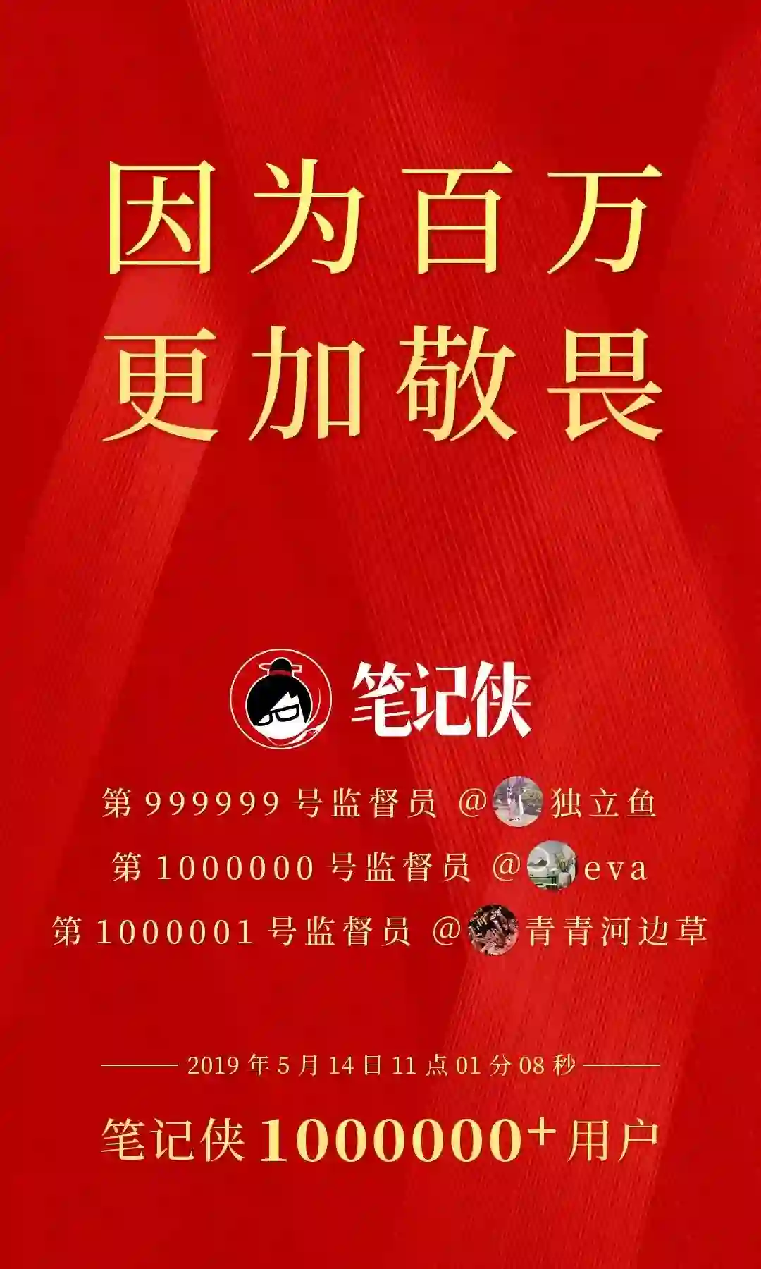 2019年5月14日11时01分08秒,笔记侠公众号的用户突破100万了!