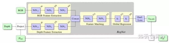 下面图展示的是Regnet的结构框图,其实现深度和RGB图像之间的标定。使用初始标定Hinit将深度点投影在RGB图像上。在CNN网络的第一和第二部分,使用NiN(Network in Network)块来提取丰富的特征以进行匹配,其中索引显示NiN块的第一卷积层的核大小k。特征通道的数量显示在每个模块的右上角。CNN网络最后一部分通过使用两个全连接层收集全局信息来对失标定进行回归。(注:NiN块由一个k×k卷积,然后是几个1×1卷积组成。)在训练期间,失标定矩阵会被随机排列,形成深度点的不同投影数据。