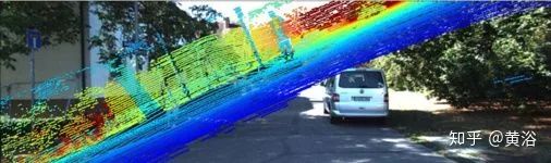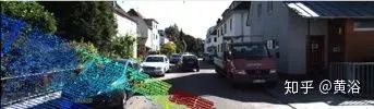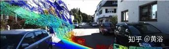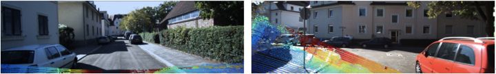 RegNet应该是第一个深度卷积神经网络(CNN)推断多传感器的6自由度(DOF)外参数标定,即激光雷达(LiDAR)和单目摄像头。RegNet将标定的三个步骤(特征提取、特征匹配和全局回归)映射到单个实时CNN模型中。在训练期间,随机对系统进行重新调整,以便训练RegNet推断出激光雷达投影到摄像头的深度测量与RGB图像之间的对应关系,并最终回归标定外参数。此外,通过迭代执行多个CNN,在不同程度失标定(decalibration)数据上进行训练。如图是一个例子。