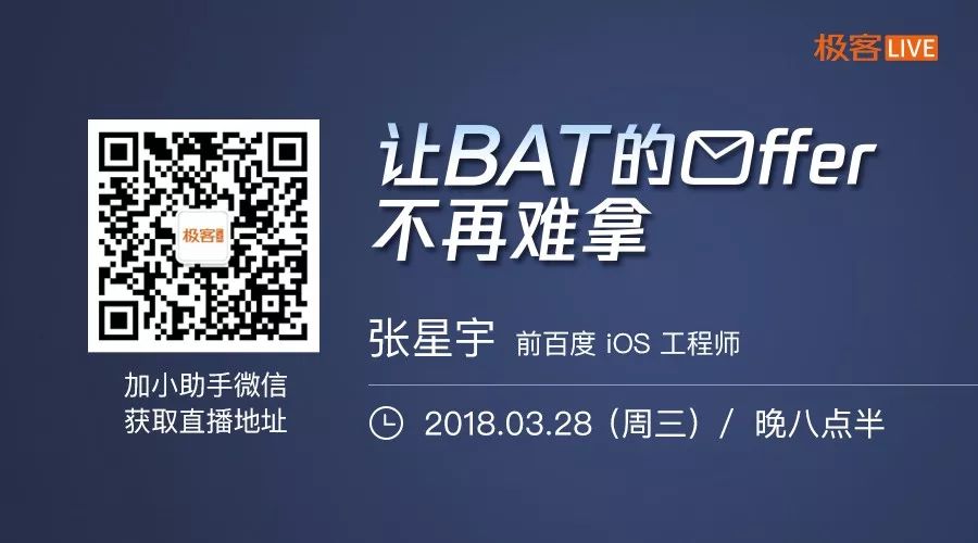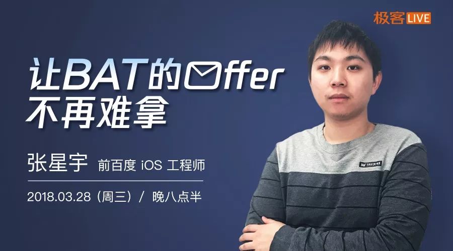 今天晚上八点半,百度前iOS工程师张星宇将在极客时间,与你分享 BAT应聘经验,让 BAT的 offer不再难拿!