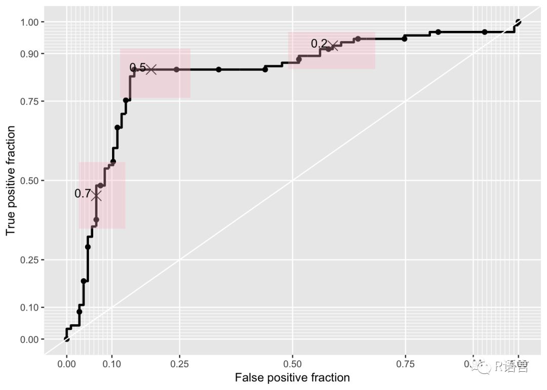 3rocplot + style_roc(theme = theme_grey) + geom_rocci(fill="pink")
