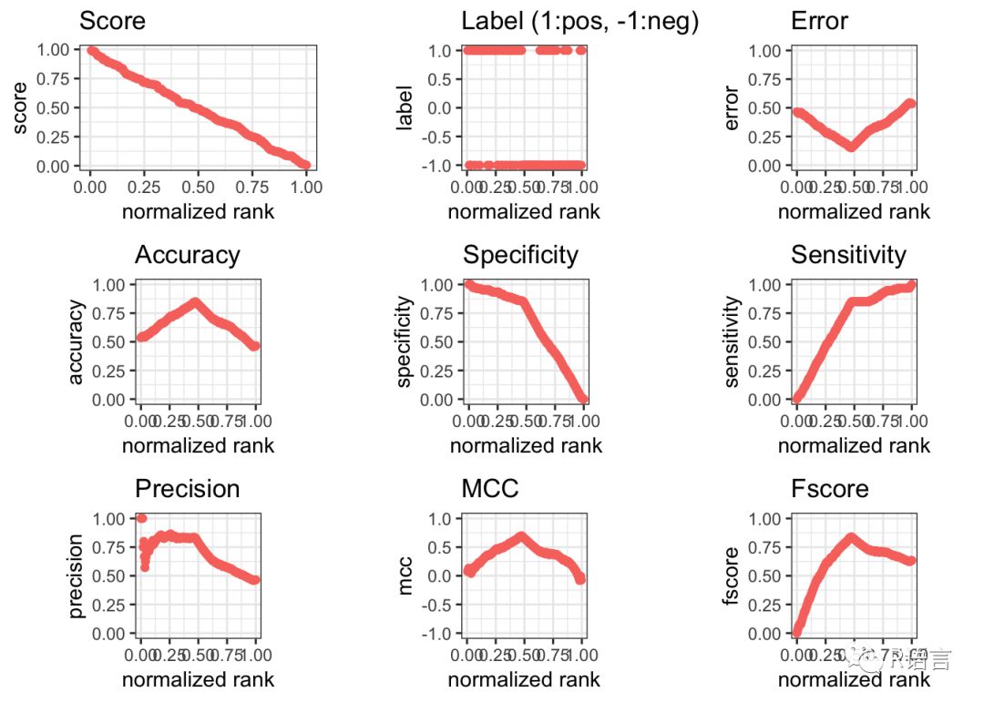 ROCR已经存在了近14年,是绘制ROC曲线的一个坚如磐石的工具。我特别喜欢performance()函数通过输入真阳性率tpr和假阳性率fpr和参数来设置曲线的计算方法。这不仅具有令人放心的透明性,还显示了通过输入适当的参数来计算二进制分类器的几乎所有性能度量的灵活性。例如,要生成precision-recall曲线,您需要输入prec和rec。虽然没有vignette,但包的文档非常好。