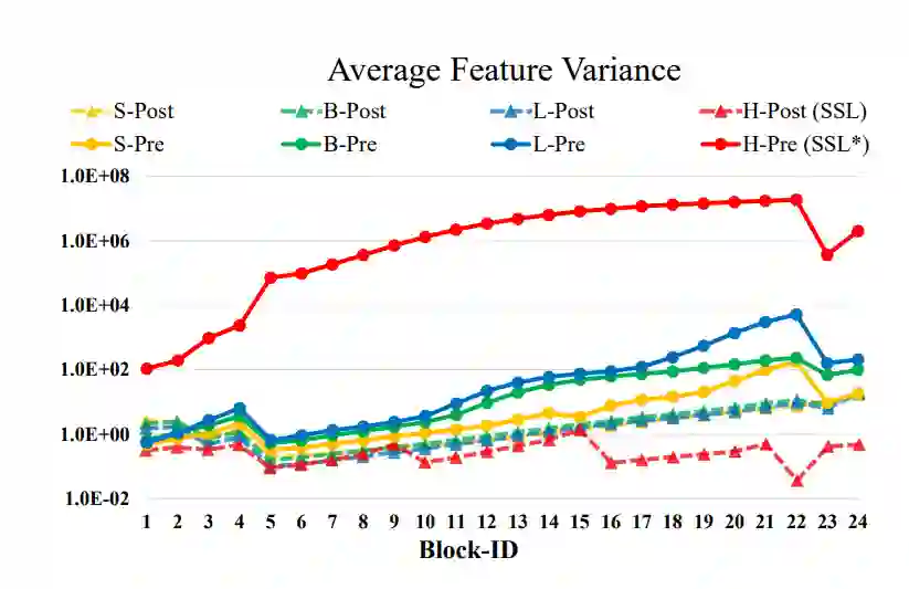 图2:各种大小模型的各层激活值。H大小的模型是在自监督学习阶段训练的,而其他规模的模型则是由分类任务训练的。*表示使用了模型崩溃前第40轮的模型权重。