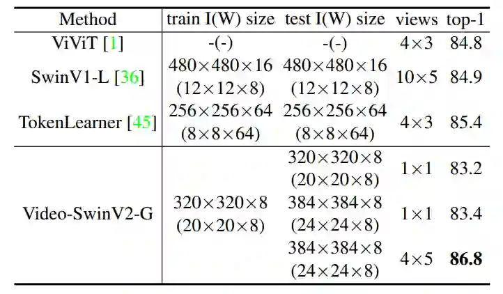 通过扩展模型容量和分辨率,Swin Transformer v2.0 在四个具有代表性的基准上均刷新了纪录,证明了视觉大模型在广泛视觉任务中的优势:在 ImageNet-V2 图像分类任务上 top-1 准确率为84.0%;在 COCO 物体检测任务上为63.1/54.4 box/mask mAP;在 ADE20K 语义分割上为59.9 mIoU;在 Kinetics-400 视频动作分类的 top-1 准确率为86.8%。