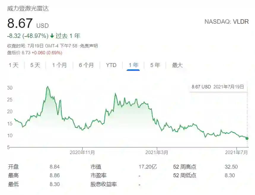 反映在股市中,Velodyne的股价已经由最高的30美元跌至如今的不到9美元,跌破发行价。