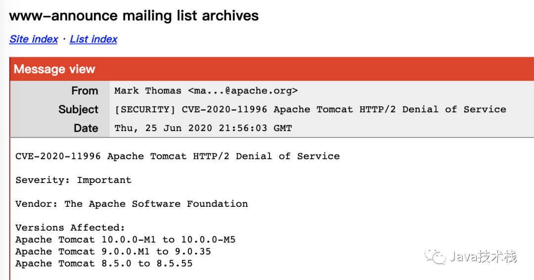 这是一封来自 Apache 官方安全团队的邮件,已通过 Apache Tomcat 用户邮件公开报告了此问题,邮件中介绍了 HTTP/2 拒绝服务漏洞的各方面细节及解决方案。