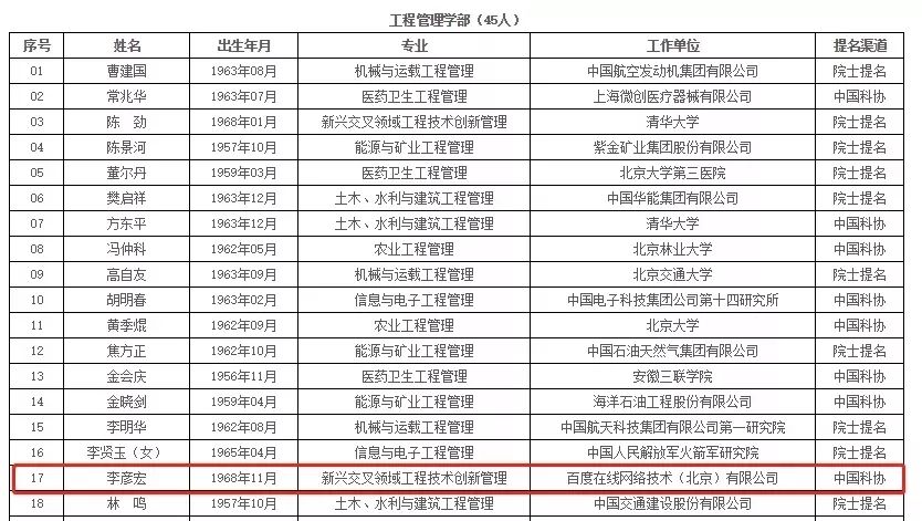 中国工程院公布的2019年院士增选有效候选人名单,李彦宏位列其中。