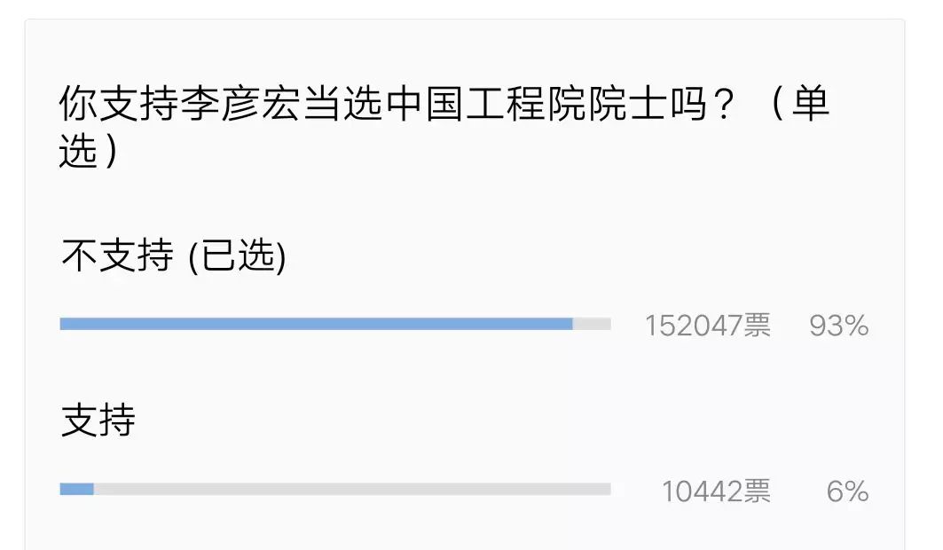 公号《大汉丞相》的投票中,反对李彦宏当选中国工程院院士的比例超过90%
