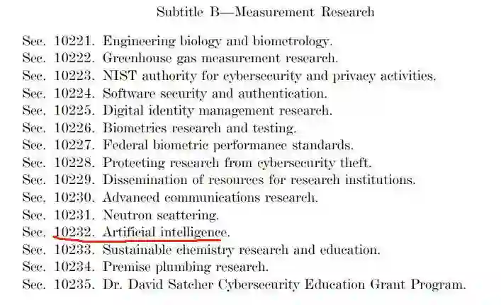 该法案的Section 10232专门针对人工智能,要求NIST主任“继续支持人工智能和数据科学的发展,并开展 2020 年国家人工智能倡议法案的活动”,这也是2021年国防授权法(National Defense Authorization Act 2021)的一部分。