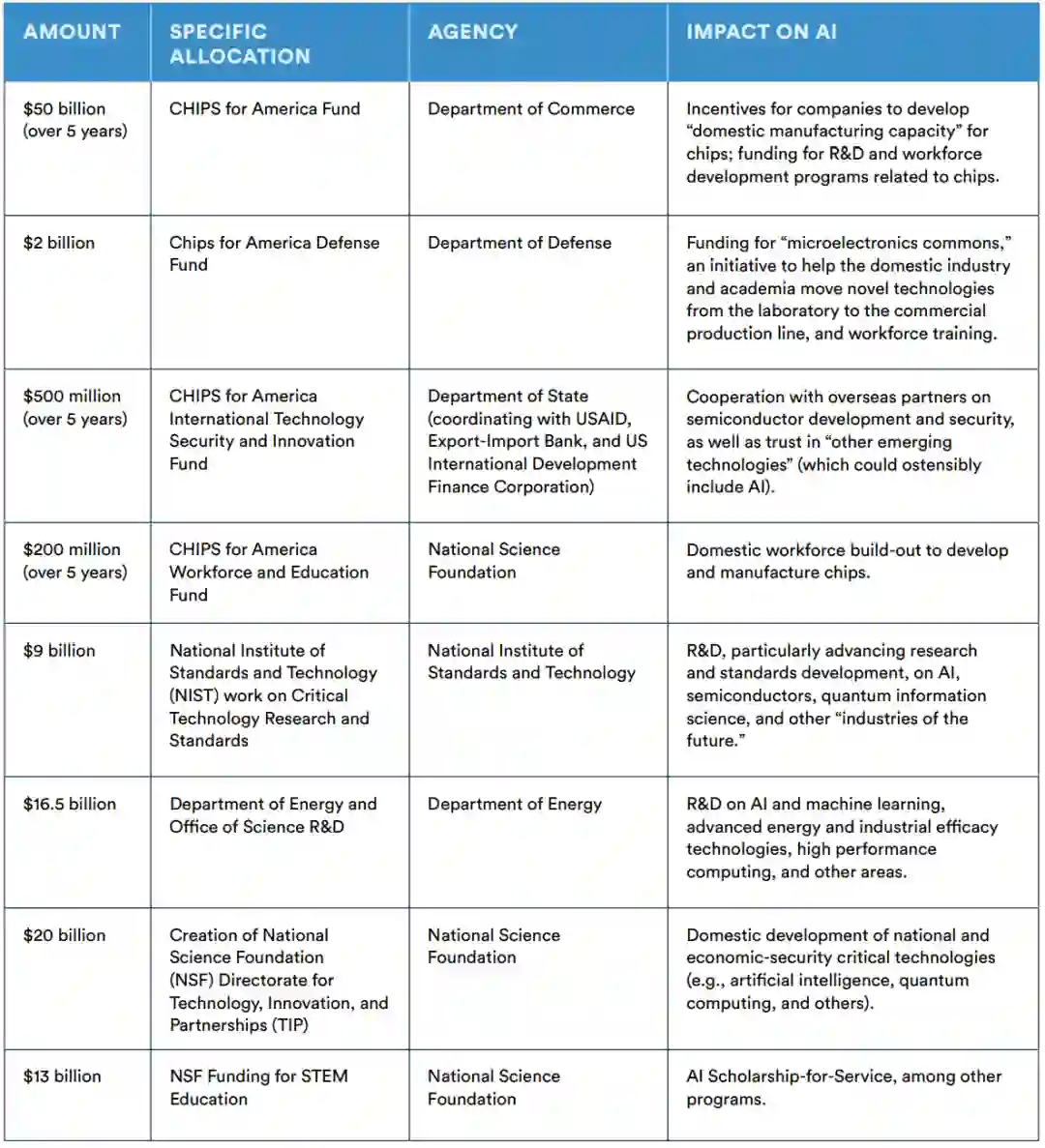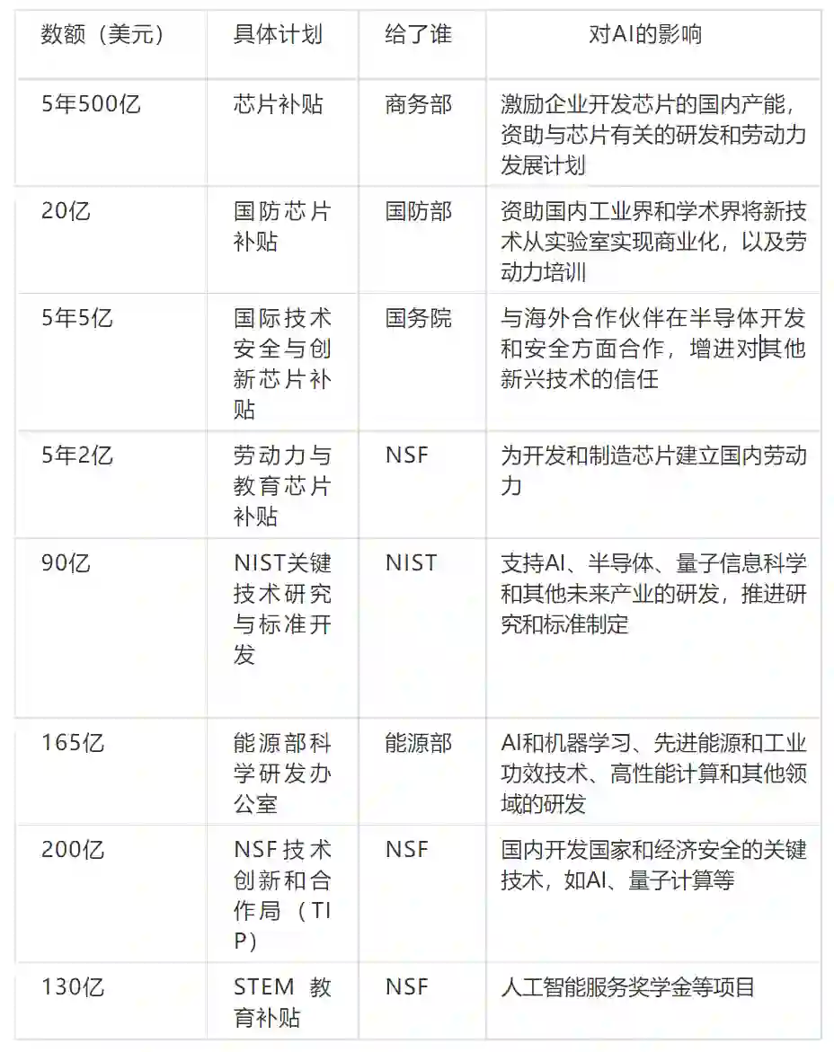 比如对半导体产业的投资,会为机器学习和人工智能的研究和开发提供动力,还有一些投资是专门针对AI的,并将法案中与AI有关的资助项目专门列了个表。