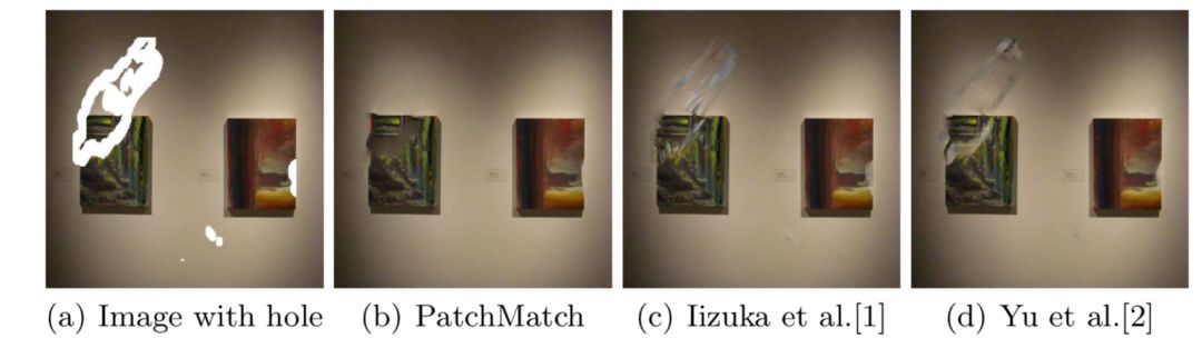 在使用深度学习方法进行图片补全的时候, 一般将缺失的区域使用白色或者是随机噪声来填充, 再使用卷积层来提取上下文特征以及后续的补全. 白色/随机噪声本来没有有效信息, 对它们与有效的信息不加区别的卷积并不合理, 这样的补全结果会出现一些副作用, 如下图所示: