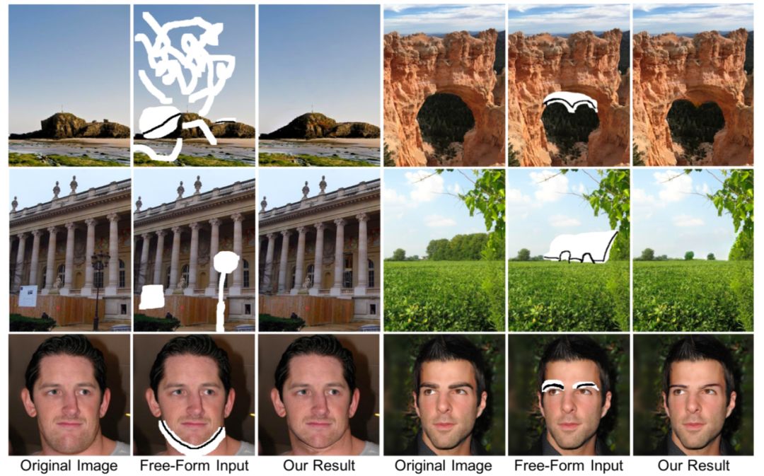 该方法的损失函数包含全局与局部判别损失以及重建损失, 不仅在补全区域的细节方面生成的比较好, 而且还可以通过巧妙地设计损失处理不规则的遮挡区域. 一些效果如下图: