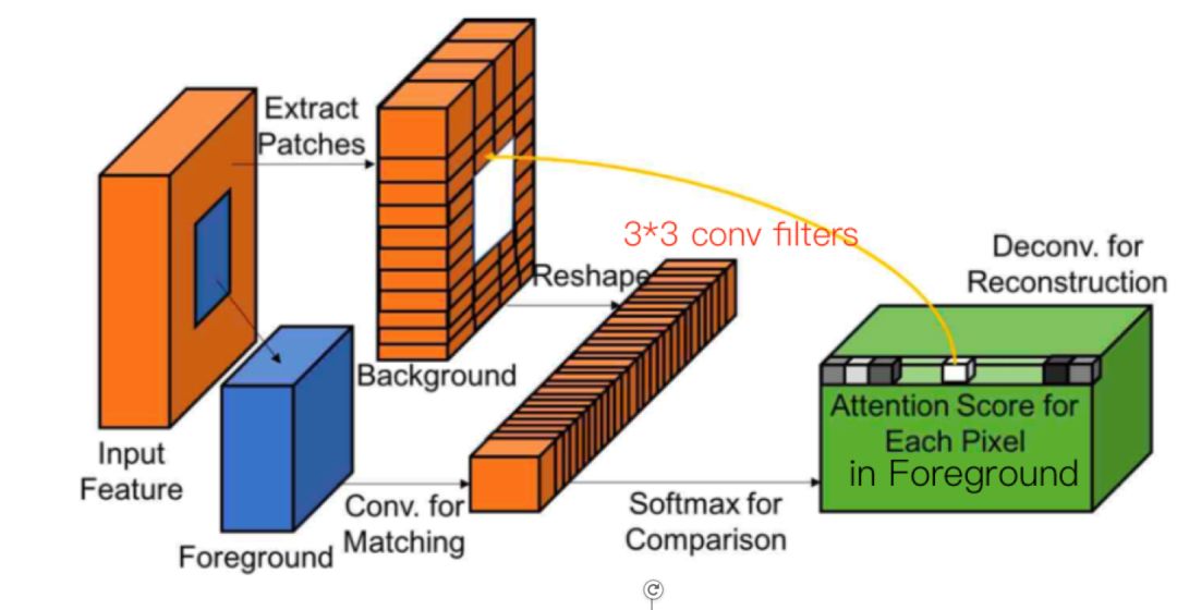 该方法的精髓在于其中的refinement network. 具体的说, 该方法将卷积看成模版匹配过程, 通过foreground(遮挡区域)与background(未遮挡区域)的patch卷积来在background中寻找与foreground的patch相似的patch. 如下图所示