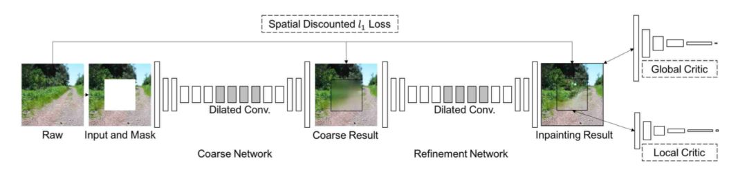 该方法的损失函数的设计包含生成图片真伪性的判别损失以及缺失区域的按像素的重建损失. 该方法生成的图片整体上看生成的效果还可以, 但是仔细观察补全区域就会发现其效果比较差了. 所以人们增加设计了针对补全区域的判别器.