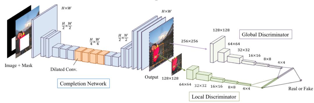 Globally and Locally Consistent ImageCompletion[2]就是增加设计了针对补全区域的判别器的一种网络, 具体的结构如下: