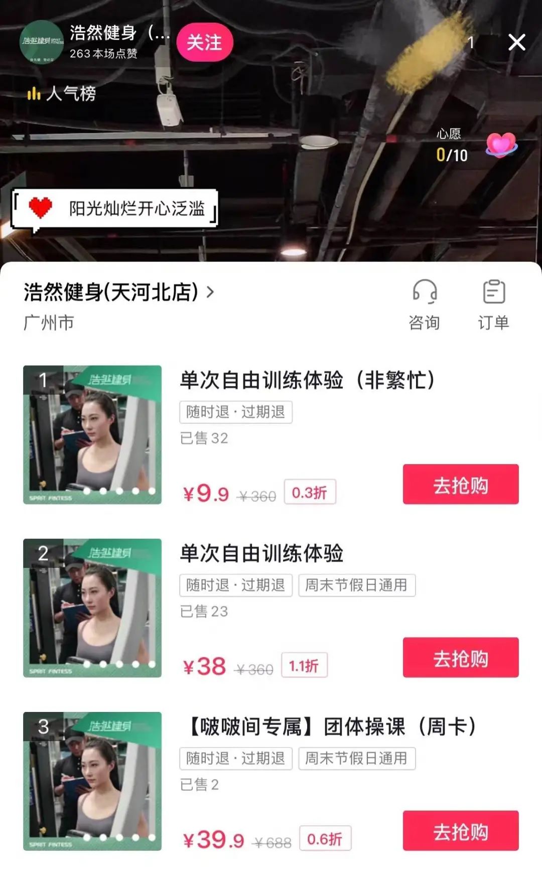健身机构“一兆韦德”,就曾在多场抖音健身直播中售卖过3500元的门店年卡、2299元的半年卡、288元的月卡+1节私教课,近30天带货GMV8.1万。一些知名度不高的小型健身工作室,则选择了上架单价在9.9元-39.9元不等的单次体检卡,但销量仅有几十。