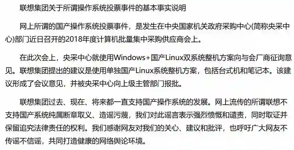 继联想集团在 5G 标准投票中未投给华为之后,5 月 21 日,有媒体再次报道称,联想集团在中央某采购中心关于预装国产操作系统的投票会上投了反对票。该报道称,本月 16 日下午,联想、惠普、宏碁、华硕四家厂商投出反对票,而另外三家厂商同方、海尔、戴尔支持国产操作系统预装。