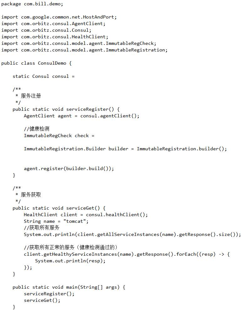 当然除了上面介绍的从Consul主动去检测服务健康外,我们还可以通过程序主动向Consul注册服务,其Java代码如下。