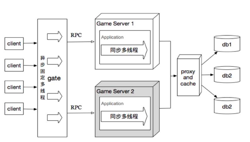 SOA架构模式是一个经典的分布式软件架构模式,服务之间使用RPC运程调用功能,而服务的注册和发现则使用ZooKeeper这样的目录服务器。这样游戏服务就拆分为三层结构:最前边的网关(gate)服务器、中间为各游戏服务器(gameServer),最后边的数据库(DB)服务器。这样把网络功能单独提取出来,让用户统一去连接网关服务器,再由网关服务器转发数据到后端游戏服务器。而游戏服务器之间数据交换也统一连接到网关服进行交换。所有与DB交互的都连接到DB服务器来代理处理。