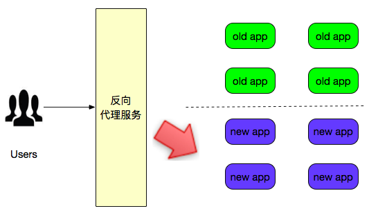 部署新的版本,通过代理将流量慢慢地切到新的版本,观察测试。这里可以通过不同的规则先把公司人员先切到新版本测试,然后再切一小部分用户进行测试,最后切全量进行测试。
