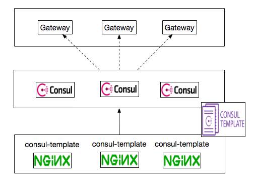 在网关层我们主要采用Etcd+Confd+Nginx或Consul+Consul-Template+Nginx两种方式来实现,两种方式都差不多,我在这里主要介绍下后者如何实现的。