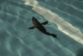 下面这只在水池里游的是自动化所的机器狗鱼,它是仿照北美狗鱼来设计的,扁平的鱼头,可以降低游动过程中受到的阻力。