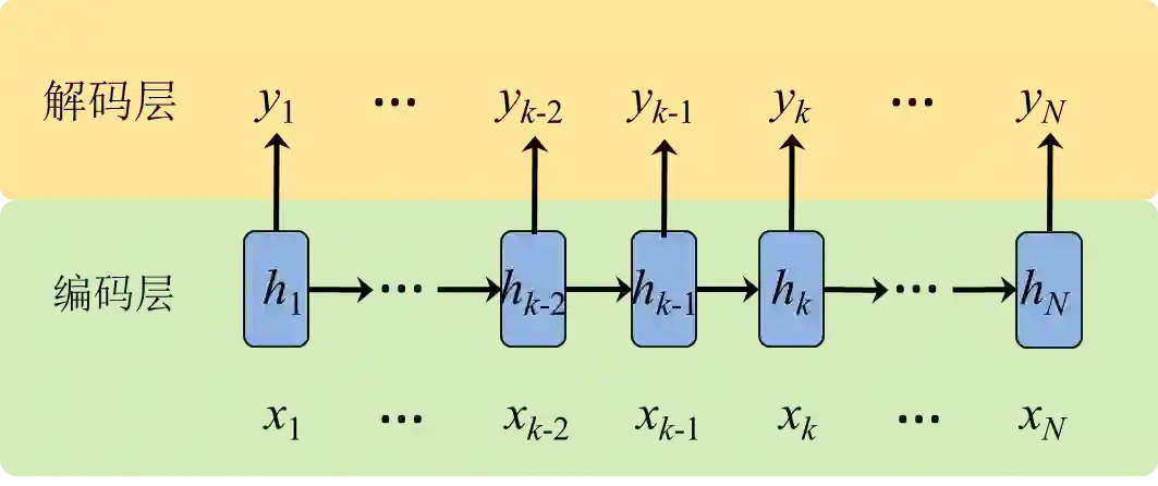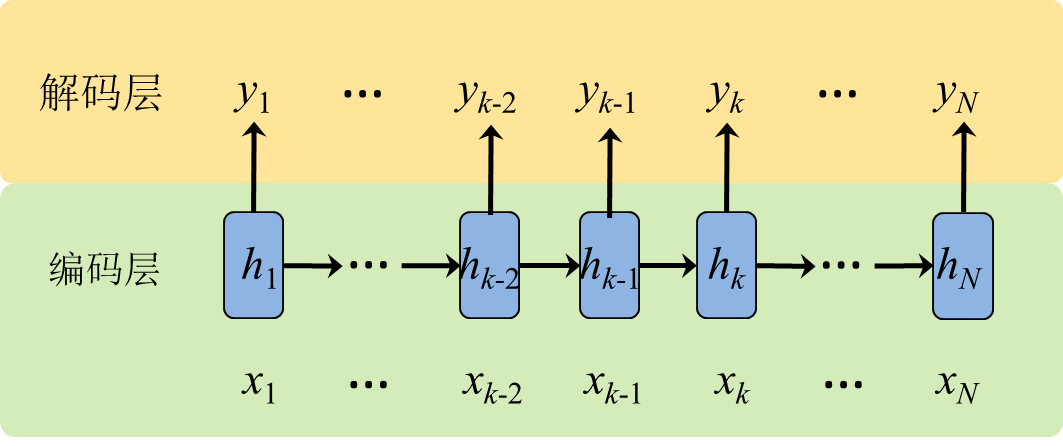 RNN的特点是建模序列数据,为了应对序列数据的变长情况,RNN采用循环结构进行建模,其一般化的基本结构如图1所示。为了方便理解,我们可以将图1的循环结构展开为一个长度为N的序列结构(见图2)。一般来说, RNN的基本结构可以分为两层:编码层和解码层。在编码层,主要是将原始序列的顺序输入依次经过激活函数变换为编码后的表达h。解码层的作用是将表达h解码为对应具体任务的输出。以标准的语言模型为例,编码层的输入为one hot的词向量,编码后获得对应单词及环境的隐表达;根据隐表达,解码层的输出为后一个单词的词分布向量,选择概率最大的为下一可能的单词输出。