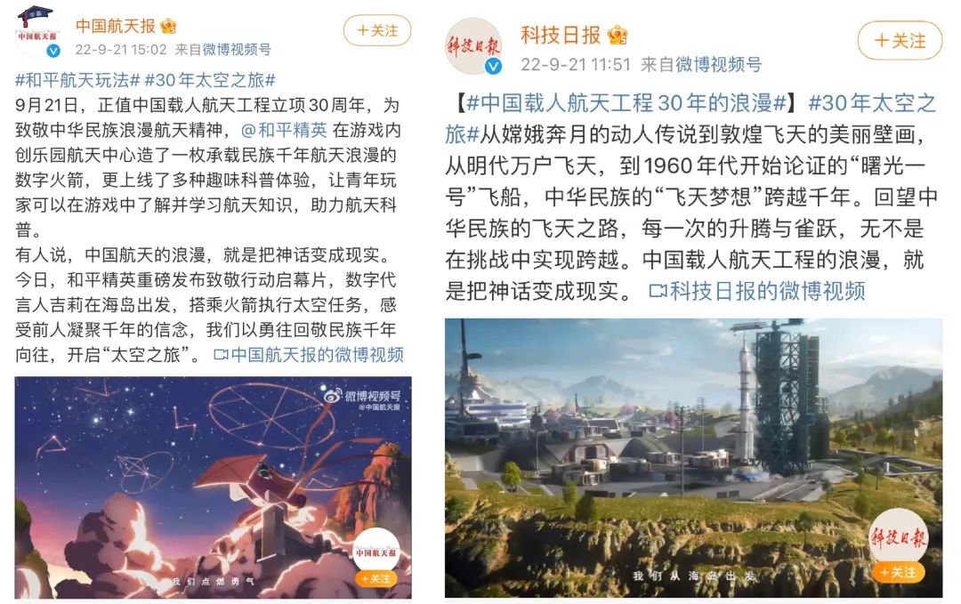 《和平精英》还加盟参与了由微博航天发起的#30年太空之旅#主题活动,与近30家航天媒体共同致敬中国载人航天工程的“三十而立”,鼓励更多玩家参与到致敬行动中来,目前话题累计阅读量已超1.4亿。