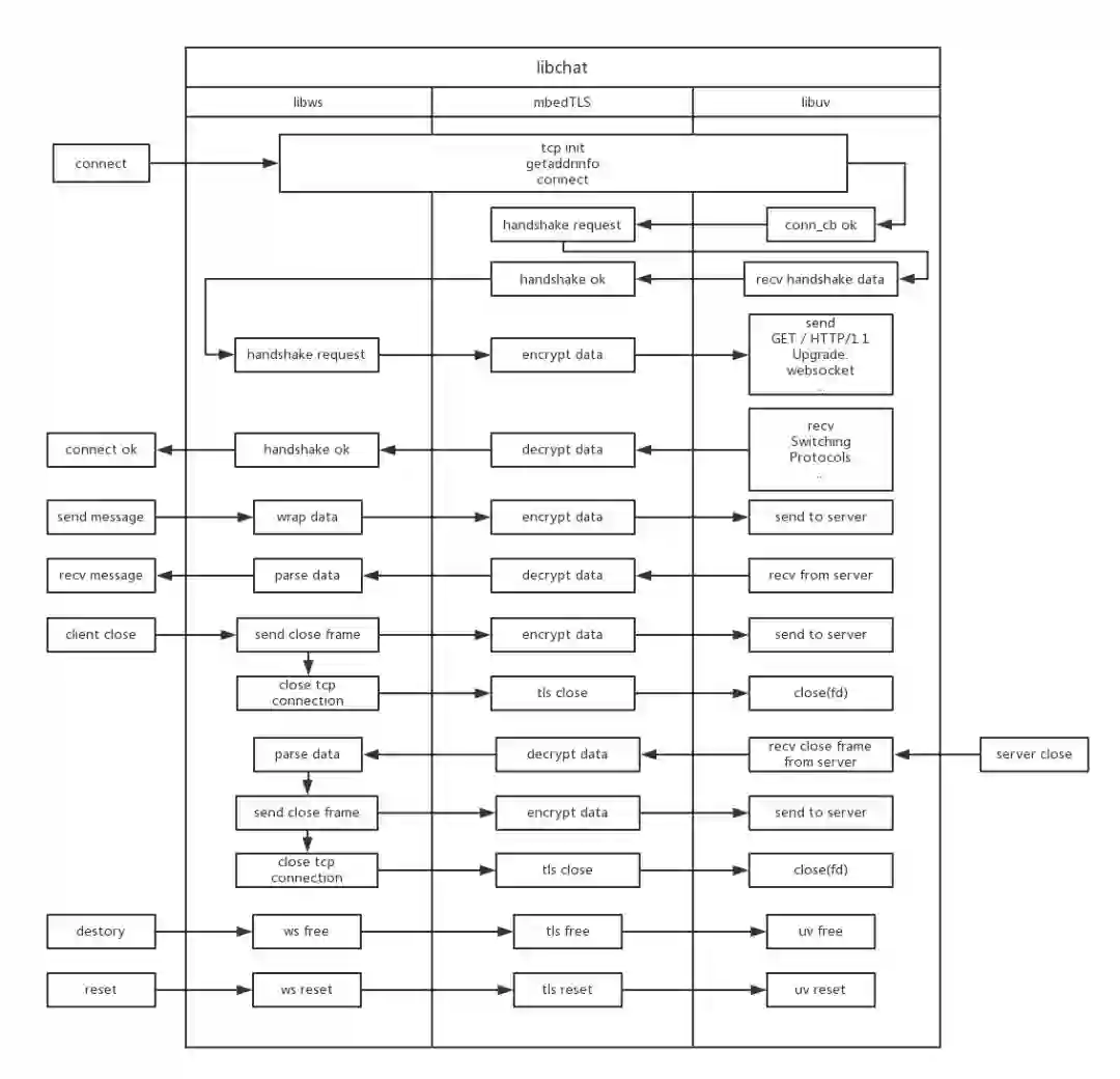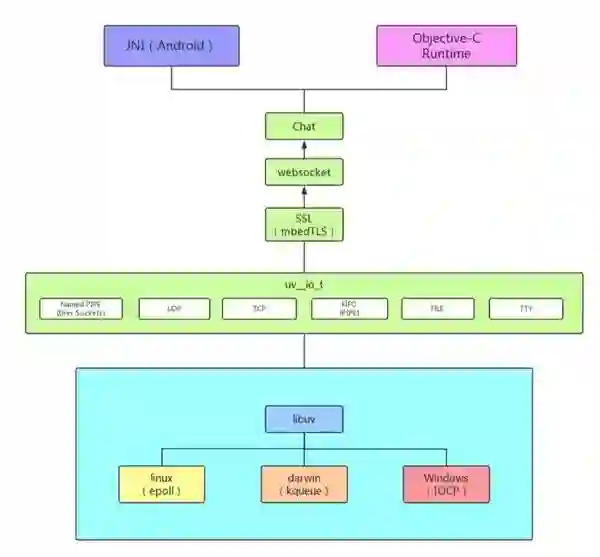 回顾一下跨平台长连接组件的设计,我们使用 libuv 和 mbedtls 分别实现 TCP 和 TLS ,参照 WebSocket 协议实现了其握手及数据读写,同时抽象出通信接口及回调,为了和原生层交互,iOS 和 Android 分别采用 runtime 消息发送和 JNI 进行原生方法调用。