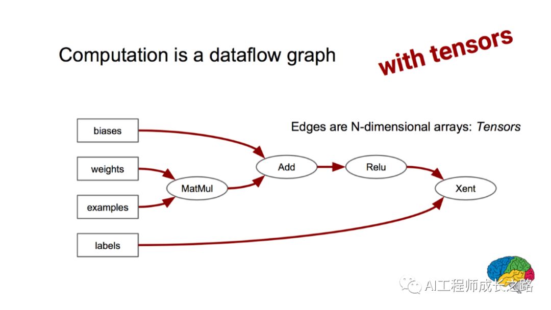 一次数值计算由对应的多维数组 (Tensor) 流过相应的算子 (Operator)而表达,即Tensor 在Flow,所以叫做Tensorflow。