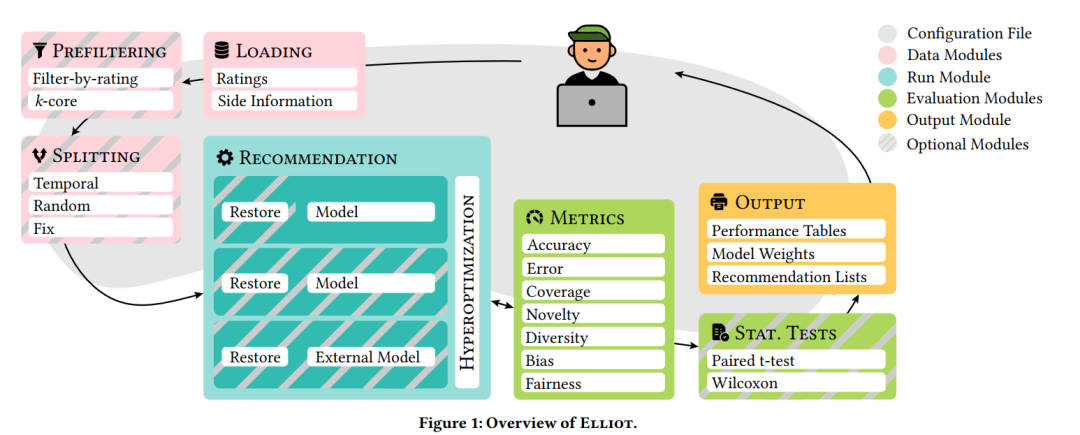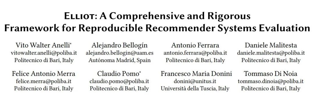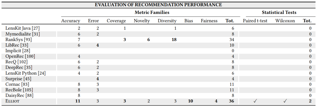 今天给大家推荐一个全面且严谨的面向学术界的推荐系统评测基准库Elliot,该库提供了36种全面的评测指标(比如准确性、偏差、公平性、新颖度以及多样性等评价指标),还提供了13种关于数据集的分离策略(Spliting methods),8种过滤策略(Filtering approaches),27种相似性选择,2种统计假设检验以及51种关于超参数搜索以及优化的策略。相比于其他的推荐算法基准库,可谓是比较全面且完整的。