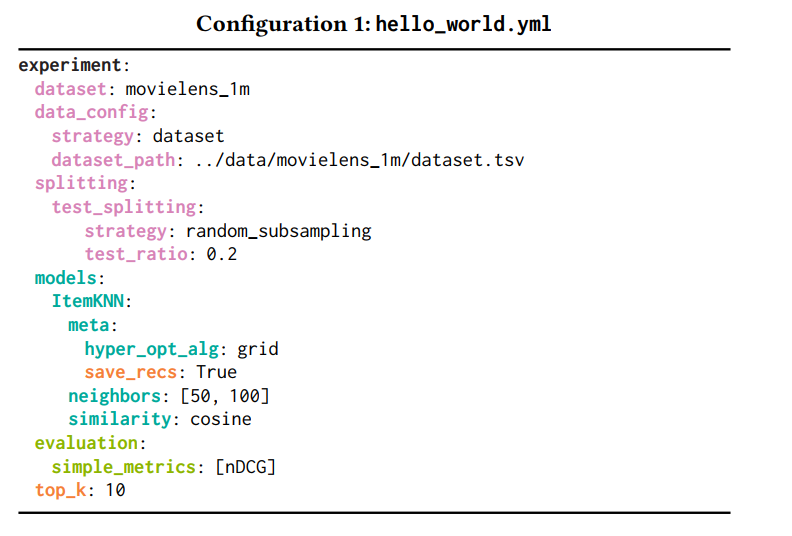 该框架通过预先编译配置文件的方式可轻松实现推荐模型的实验复现,模型的配置文件如下图所示,涵盖了所使用的测试数据集名称以及路径、采样方式、对比方法等细节。