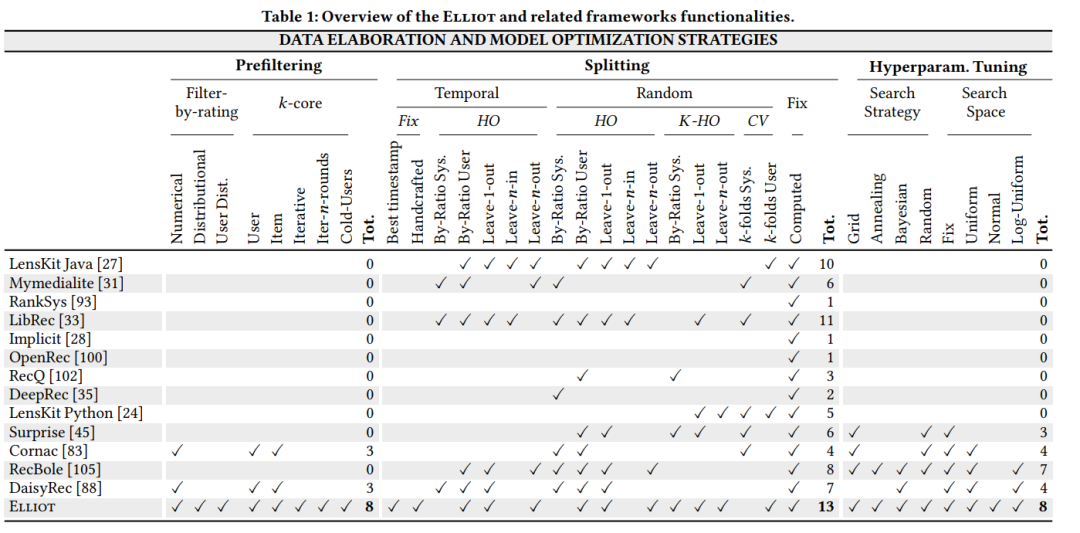 该算法库在数据过滤、数据分离以及超参数优化方面提供了全面的模式设置,通过下图与同类型推荐算法库(LibRec、RecBole以及RecQ等)的比较可以看出其全面性。
