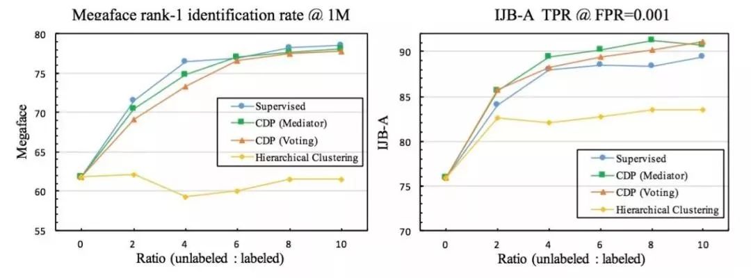 我们的实验中使用CDP聚类后的数据加入人脸识别模型的训练之后,可以让模型达到接近全监督(使用ground truth标签)的结果。如下图所示: