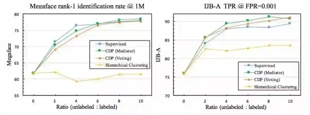 在两个测试集(benchmark)上,随着数据的增多,用CDP聚类结果训练的人脸模型性能的增长接近全监督模型(所有数据都使用ground truth标注)。有趣的是在IJB-A上我们的结果超过了全监督模型,原因可能是训练集的ground truth标签会有一些噪声(noise),例如误标注,导致全监督模型在IJB-A的某些测试样例上表现不佳。