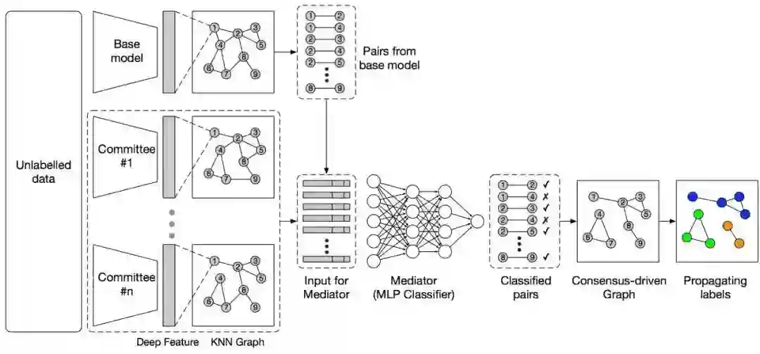 CDP本质是学习一个metric,也就是对样本对(pairs)进行判断。如下图,CDP首先使用多个人脸识别模型构建成一个委员会(committee), committee中每个成员对基础模型中相连的pairs提供包括关系(是否是neighbor)、相似度、局部结构等信息,然后使用一个多层感知机(MLP)来整合这些信息并作出预测(即这个pair是否是同一个人)。这个过程可以类比成一个投票的过程,committee负责考察一个候选人(pair)的各方面信息,将信息汇总给MLP进行决定。最后将所有的positive pairs组成一个新的graph称为consensus-driven graph。在此graph上使用简单的连通域搜索并动态剪枝即可快速得到聚类。由于MLP需要使用一部分有标签的数据来训练得到,所以CDP是一种基于有监督的metric的聚类方法。方法的更多细节可以参考我们的论文和代码,并欢迎讨论。