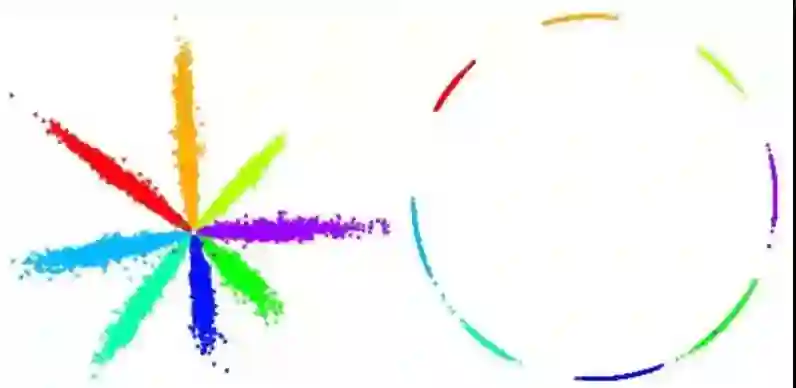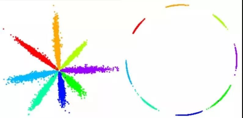 这种方式决定了这些经过映射(embedding)后的人脸在特征空间里分布在不同的锥形(Cone)中(下左图),因而可以使用余弦相似度(Cosine Similarity)来度量相似度。或者如果对人脸特征做二范数(L2)归一化,那么人脸特征则会分布在一个球面上(下右图),这样可以使用L2距离来度量。