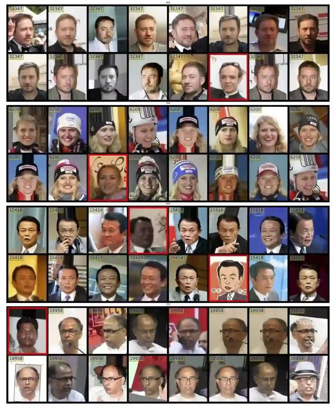 (d) 缺乏较好的离群值(outliers)控制机制。outliers来源于人脸识别模型对难样本的embedding误差,以及观测到的数据不完整。尽管部分聚类算法例如DBSCAN理论上对outliers鲁棒,但从其实际表现来讲这个问题远没有得到解决。