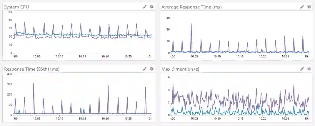 最后,Rust 的另一个好处是它有一个快速演化的生态系统。最近,tokio(我们使用的异步运行时) 发布了 0.2 版。我们进行了升级,它免费带来了 CPU 方面的优化。下面你可以看到 CPU 在 16 号左右开始就一直很低。