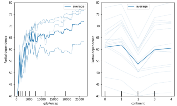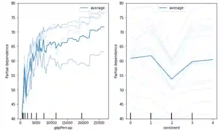 来自 scikit-learn gapminder 数据集的 PDP 和 ICE 图。