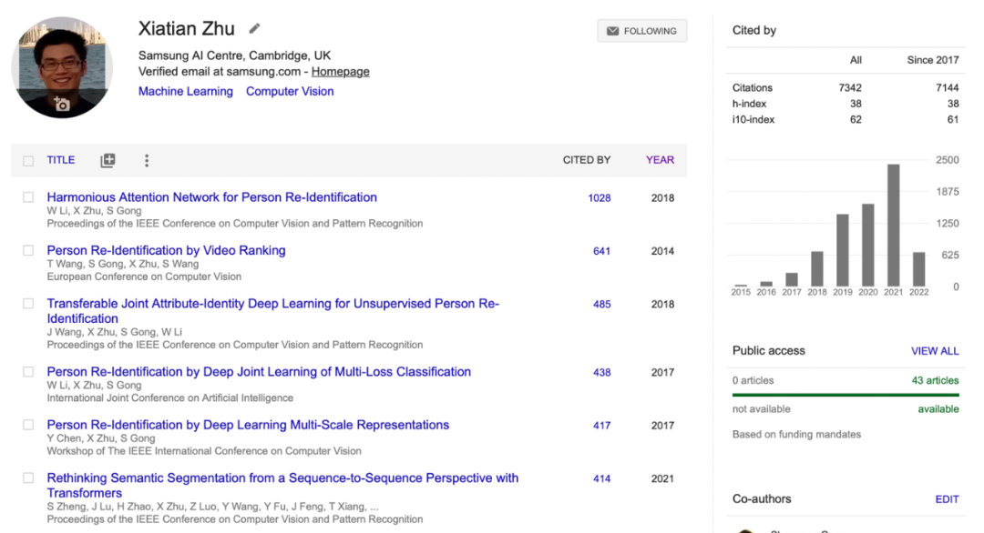 朱老师的实验室是萨里大学的视觉、语音和信号处理中心的组成部分。该中心是视听机器感知研究领域的国际领导者,立志于创造可以感知世界的机器。该中心的研究催生了生物识别、通信、医疗和创意行业屡获殊荣的衍生公司。朱老师和他的团队已获得过多次项国际学术竞赛奖项,在顶级国际会议和期刊(CVPR、ICCV、ECCV、NeurIPS、ICML、AAAI、IJCAI、ICDM、IJCV、TPAMI、TNNLS、TIP、AI、PR 等)发表多篇高质量论文,总引用数达 7000 余次。